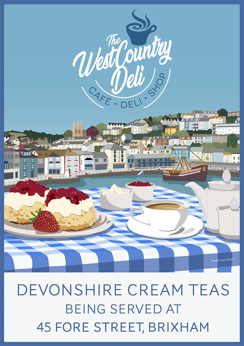 Westcountry Deli is a charming independent deli and café based in Brixham, Devon, celebrating the very best of West Country food and produce. Jennifer was commissioned to create an illustration for them, depicting that most beloved of Devon traditions — the cream tea. And in true Devon style, the illustration settles the great debate once and for all... cream first, jam on top.